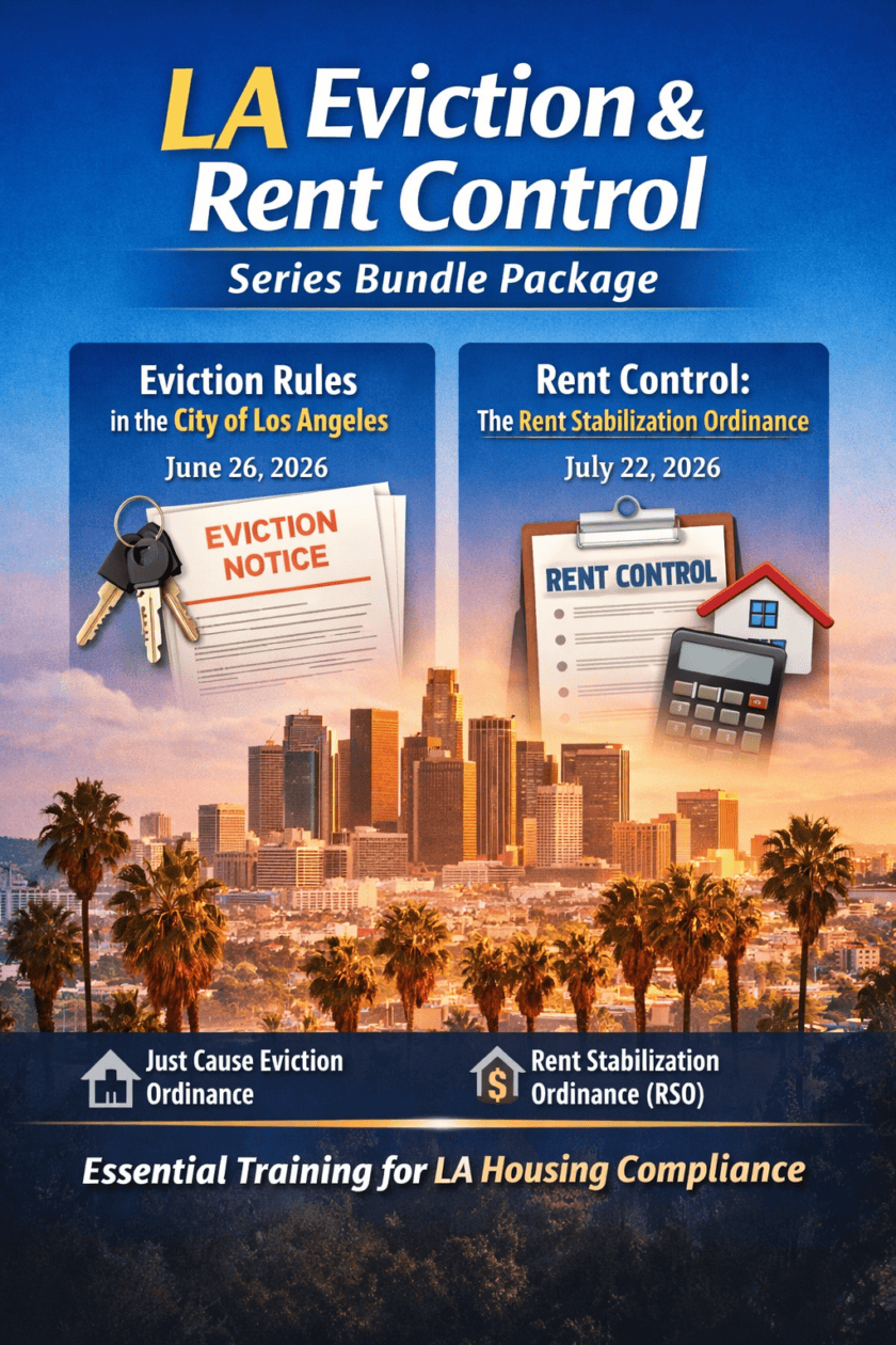 The LA Eviction & Rent Control Series Bundle Package provides a two-part overview of the key regulations governing residential rental housing in the City of Los Angeles. This series covers eviction rules under the Rent Stabilization Ordinance (RSO) and the Just Cause for Eviction Ordinance (JCO), as well as rent control requirements under the RSO. Participants will gain practical guidance on determining ordinance applicability, complying with notice and filing requirements, calculating allowable rent increases, and understanding relocation assistance obligations. The sessions also review relevant CAA forms used for properties located within the City of Los Angeles.
